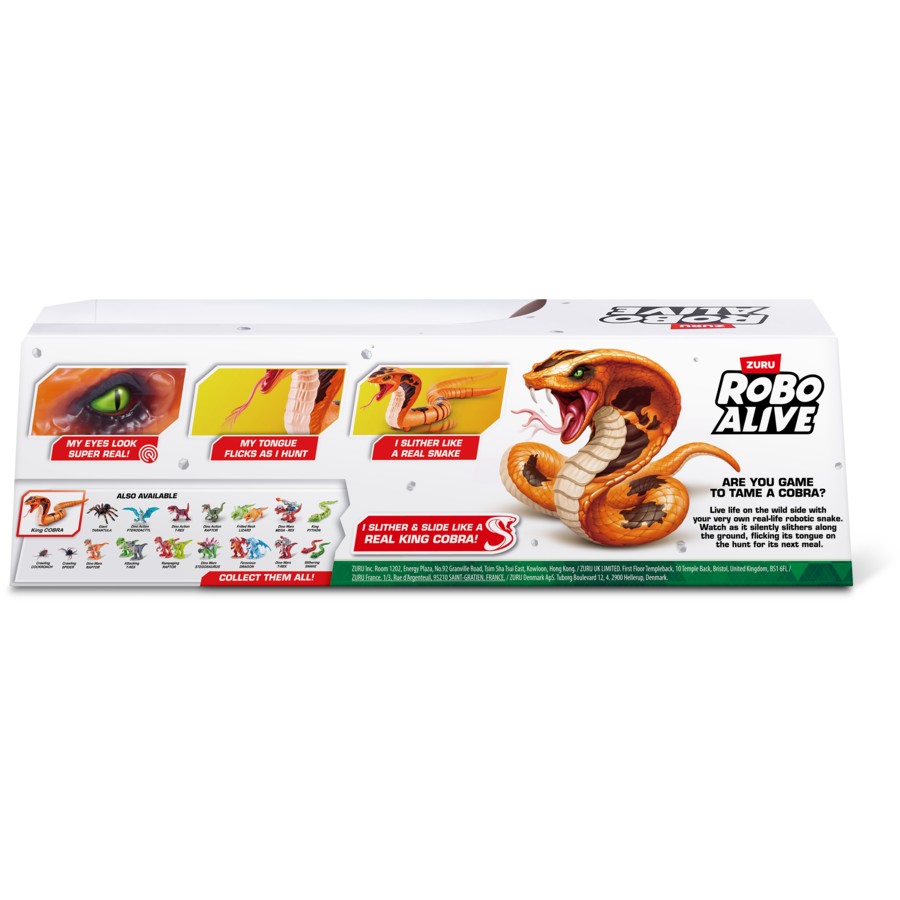 - Unleash the thrill with the Robo Alive King Cobra! Measuring a terrifying 17.52 inches (44.5 cm) from tongue to tail. Featuring smart movement technology, it has realistic tongue-flicking movements and slithers across the floor, hunting its prey—watch out, it could be you! Perfect for epic pranks, hide it under the dining table or sneak it into a friend&39;s backpack for blood-curdling screams. With ultra-realistic snakeskin, this King Cobra looks as frightening as the real thing. Dare to pick it up and collect the entire Reptile Collection for an unforgettable adventure!