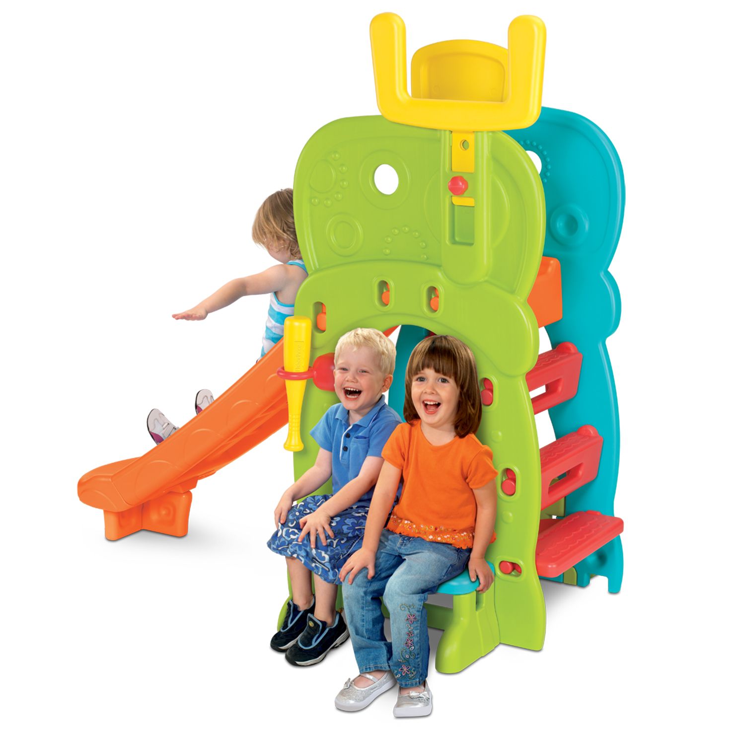Features: • Product Dimensions: 81.3 x 142.2 x 132.1 cm • 5-in-1 Sports club: Basketball, football, soccer, T-ball and golf putting • 5 Feet slide with extra wide, textured grip steps • Incl. basketball board and football goal • Interior and outside sitting bench. 3-5 Years.