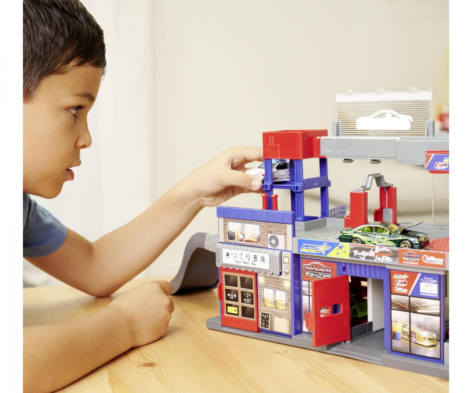 The parking garage is designed to match the "Japan Series" vehicles from the Majorette Deluxe range.