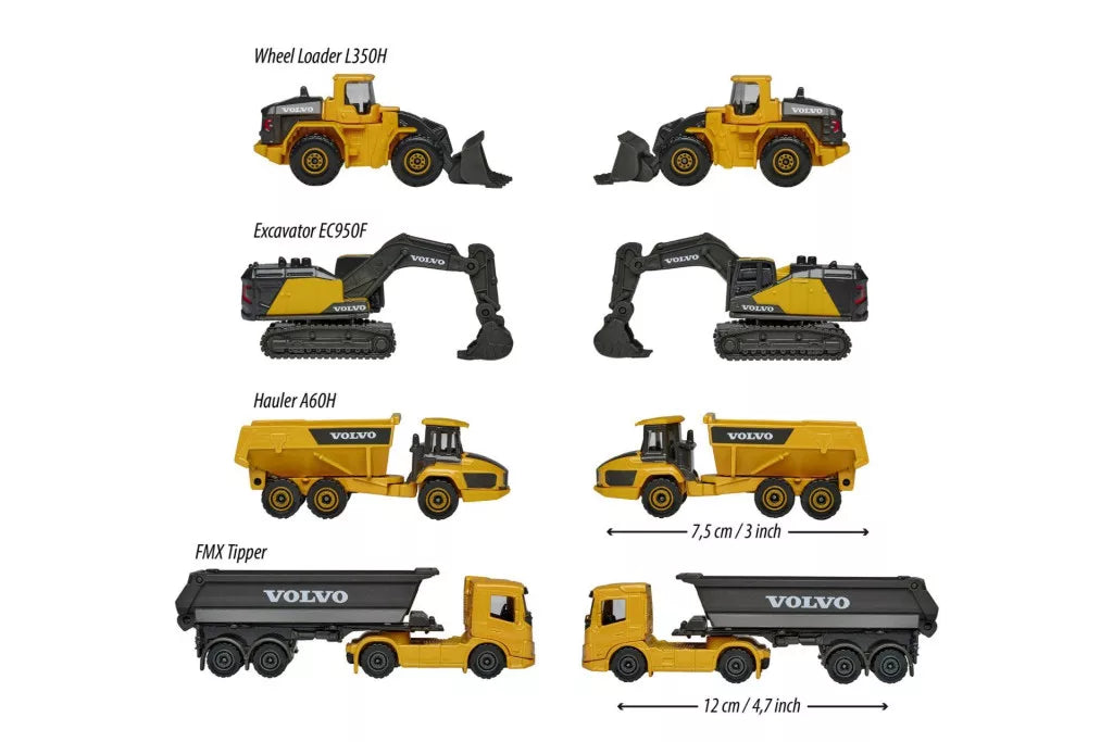 Each vehicle comes with a sturdy die-cast metal body and plastic details for durability and accurate proportions. Thanks to the official Volvo license, the models closely resemble the real L350H wheel loader, EC950F excavator, A60H hauler and FMX tipper, from the yellow-and-black colour scheme to the distinctive cab designs.