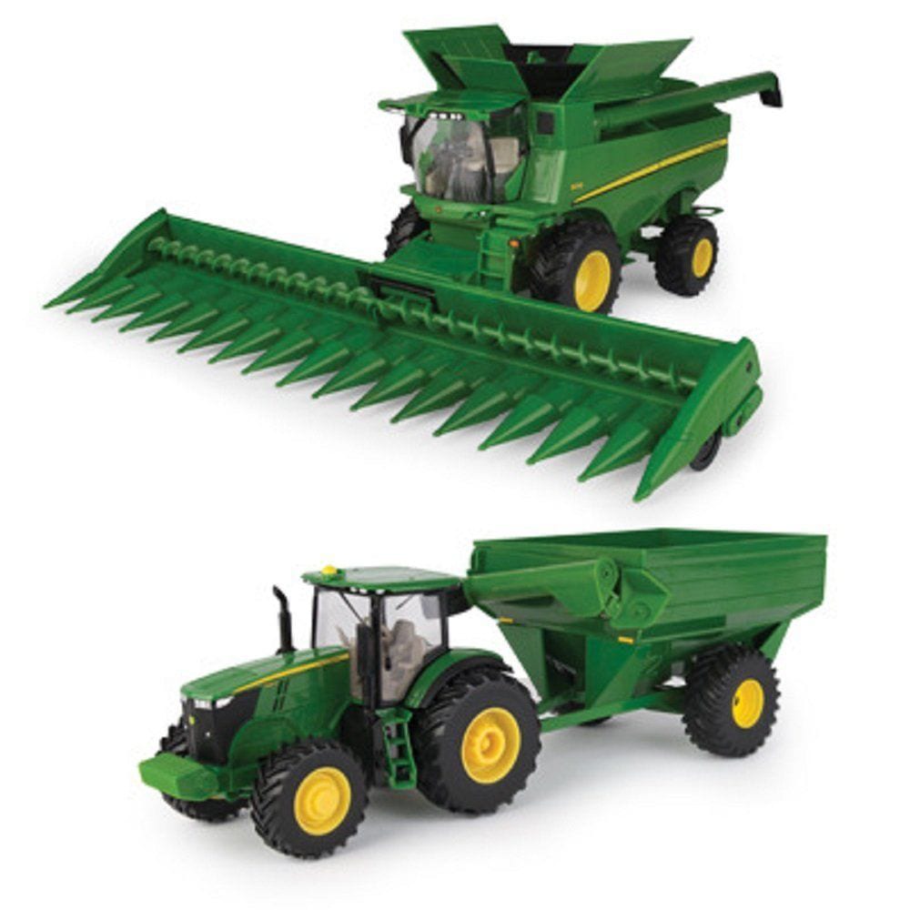 Set includes the 1:32 John Deere S690 Combine with Corn Head, 7R Tractor and a green grain cart.