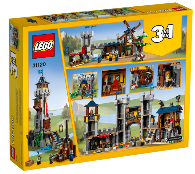 Creative kids have the chance to build 3 different models with this LEGO Creator 3in1 set. They can start with the Medieval Castle, rebuild it into a castle tower with a catapult or transform it into a bustling marketplace with a water mill, tower and prison.